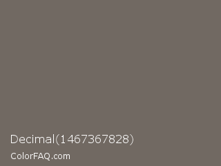 Decimal 1467367828 Color is a normal orange color and the nearest color is Flint #6f6a61. Hex code #716962 and RGB value is rgb(113,105,98). In RGB color space, this color is composed of 44% red, 41% green, 38% blue, In CMYK color space, this color is composed of 0% cyan, 7% magenta, 13% yellow , 56% black , In HSL color space, this color has a hue angle of 28° , 7% saturation and 41% lightness.