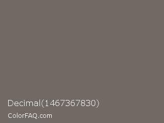 Decimal 1467367830 Color is a normal orange color and the nearest color is Flint #6f6a61. Hex code #716964 and RGB value is rgb(113,105,100). In RGB color space, this color is composed of 44% red, 41% green, 39% blue, In CMYK color space, this color is composed of 0% cyan, 7% magenta, 12% yellow , 56% black , In HSL color space, this color has a hue angle of 23° , 6% saturation and 42% lightness.