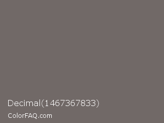 Decimal 1467367833 Color is a normal red color and the nearest color is Flint #6f6a61. Hex code #716967 and RGB value is rgb(113,105,103). In RGB color space, this color is composed of 44% red, 41% green, 40% blue, In CMYK color space, this color is composed of 0% cyan, 7% magenta, 9% yellow , 56% black , In HSL color space, this color has a hue angle of 12° , 5% saturation and 42% lightness.