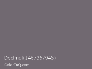Decimal 1467367945 Color is a normal magenta color and the nearest color is Dove Gray #6d6c6c. Hex code #716971 and RGB value is rgb(113,105,113). In RGB color space, this color is composed of 44% red, 41% green, 44% blue, In CMYK color space, this color is composed of 0% cyan, 7% magenta, 0% yellow , 56% black , In HSL color space, this color has a hue angle of 300° , 4% saturation and 43% lightness.