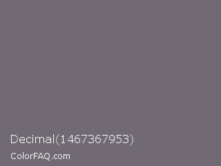 Decimal 1467367953 Color is a normal purple color and the nearest color is Dove Gray #6d6c6c. Hex code #716973 and RGB value is rgb(113,105,115). In RGB color space, this color is composed of 44% red, 41% green, 45% blue, In CMYK color space, this color is composed of 2% cyan, 9% magenta, 0% yellow , 55% black , In HSL color space, this color has a hue angle of 288° , 5% saturation and 43% lightness.