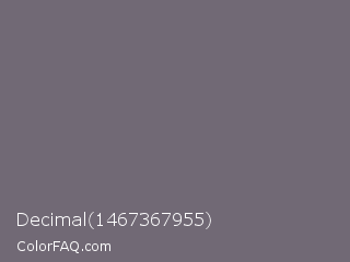 Decimal 1467367955 Color is a normal purple color and the nearest color is Old Lavender #796878. Hex code #716975 and RGB value is rgb(113,105,117). In RGB color space, this color is composed of 44% red, 41% green, 46% blue, In CMYK color space, this color is composed of 3% cyan, 10% magenta, 0% yellow , 54% black , In HSL color space, this color has a hue angle of 280° , 5% saturation and 44% lightness.