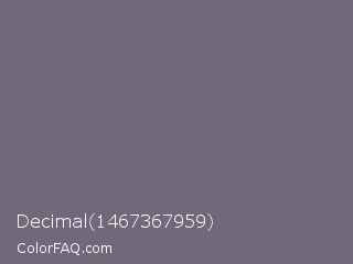 Decimal 1467367959 Color is a normal violet color and the nearest color is Old Lavender #796878. Hex code #716979 and RGB value is rgb(113,105,121). In RGB color space, this color is composed of 44% red, 41% green, 47% blue, In CMYK color space, this color is composed of 7% cyan, 13% magenta, 0% yellow , 53% black , In HSL color space, this color has a hue angle of 270° , 7% saturation and 44% lightness.