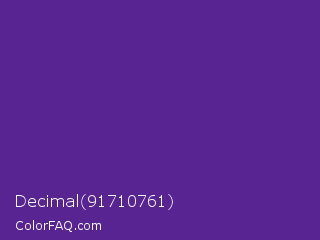 Decimal 91710761 Color is a normal violet color and the nearest color is Daisy Bush #4f2398. Hex code #582491 and RGB value is rgb(88,36,145). In RGB color space, this color is composed of 35% red, 14% green, 57% blue, In CMYK color space, this color is composed of 39% cyan, 75% magenta, 0% yellow , 43% black , In HSL color space, this color has a hue angle of 269° , 60% saturation and 35% lightness.