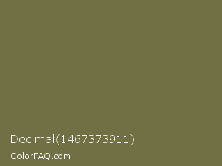 Decimal 1467373911 Color is a normal yellow color and the nearest color is Go Ben #726d4e. Hex code #717045 and RGB value is rgb(113,112,69). In RGB color space, this color is composed of 44% red, 44% green, 27% blue, In CMYK color space, this color is composed of 0% cyan, 1% magenta, 39% yellow , 56% black , In HSL color space, this color has a hue angle of 59° , 24% saturation and 36% lightness.