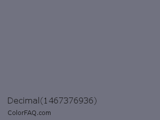 Decimal 1467376936 Color is a normal blue color and the nearest color is Storm Gray #717486. Hex code #717280 and RGB value is rgb(113,114,128). In RGB color space, this color is composed of 44% red, 45% green, 50% blue, In CMYK color space, this color is composed of 12% cyan, 11% magenta, 0% yellow , 50% black , In HSL color space, this color has a hue angle of 236° , 6% saturation and 47% lightness.