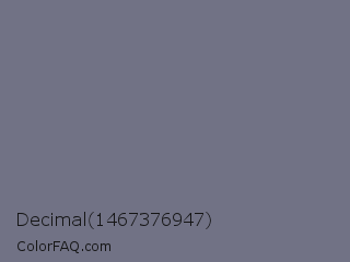 Decimal 1467376947 Color is a normal blue color and the nearest color is Storm Gray #717486. Hex code #717285 and RGB value is rgb(113,114,133). In RGB color space, this color is composed of 44% red, 45% green, 52% blue, In CMYK color space, this color is composed of 15% cyan, 14% magenta, 0% yellow , 48% black , In HSL color space, this color has a hue angle of 237° , 8% saturation and 48% lightness.