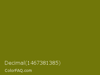 Decimal 1467381385 Color is a dark yellow color and the nearest color is Olivetone #716e10. Hex code #717709 and RGB value is rgb(113,119,9). In RGB color space, this color is composed of 44% red, 47% green, 4% blue, In CMYK color space, this color is composed of 5% cyan, 0% magenta, 92% yellow , 53% black , In HSL color space, this color has a hue angle of 63° , 86% saturation and 25% lightness.