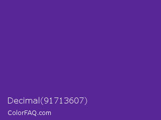 Decimal 91713607 Color is a normal violet color and the nearest color is Daisy Bush #4f2398. Hex code #582697 and RGB value is rgb(88,38,151). In RGB color space, this color is composed of 35% red, 15% green, 59% blue, In CMYK color space, this color is composed of 42% cyan, 75% magenta, 0% yellow , 41% black , In HSL color space, this color has a hue angle of 267° , 60% saturation and 37% lightness.