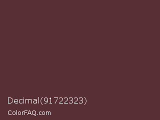 Decimal 91722323 Color is a dark red color and the nearest color is Congo Brown #593737. Hex code #582f35 and RGB value is rgb(88,47,53). In RGB color space, this color is composed of 35% red, 18% green, 21% blue, In CMYK color space, this color is composed of 0% cyan, 47% magenta, 40% yellow , 65% black , In HSL color space, this color has a hue angle of 351° , 30% saturation and 26% lightness.
