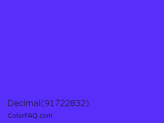 Decimal 91722832 Color is a normal indigo color and the nearest color is Han Purple #5218fa. Hex code #582ffa and RGB value is rgb(88,47,250). In RGB color space, this color is composed of 35% red, 18% green, 98% blue, In CMYK color space, this color is composed of 65% cyan, 81% magenta, 0% yellow , 2% black , In HSL color space, this color has a hue angle of 252° , 95% saturation and 58% lightness.