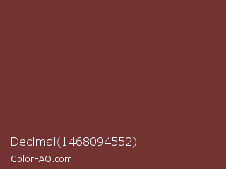 Decimal 1468094552 Color is a normal red color and the nearest color is Wine #722f37. Hex code #723332 and RGB value is rgb(114,51,50). In RGB color space, this color is composed of 45% red, 20% green, 20% blue, In CMYK color space, this color is composed of 0% cyan, 55% magenta, 56% yellow , 55% black , In HSL color space, this color has a hue angle of 1° , 39% saturation and 32% lightness.