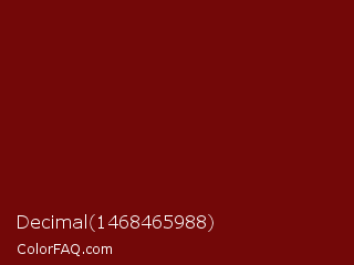 Decimal 1468465988 Color is a dark red color and the nearest color is Red Oxide #6e0902. Hex code #730808 and RGB value is rgb(115,8,8). In RGB color space, this color is composed of 45% red, 3% green, 3% blue, In CMYK color space, this color is composed of 0% cyan, 93% magenta, 93% yellow , 55% black , In HSL color space, this color has a hue angle of 0° , 87% saturation and 24% lightness.