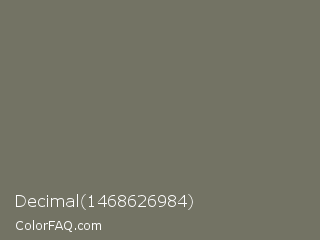Decimal 1468626984 Color is a normal yellow color and the nearest color is Pablo #776f61. Hex code #737364 and RGB value is rgb(115,115,100). In RGB color space, this color is composed of 45% red, 45% green, 39% blue, In CMYK color space, this color is composed of 0% cyan, 0% magenta, 13% yellow , 55% black , In HSL color space, this color has a hue angle of 60° , 7% saturation and 42% lightness.