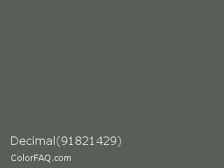 Decimal 91821429 Color is a normal green color and the nearest color is Chicago #5d5c58. Hex code #585f57 and RGB value is rgb(88,95,87). In RGB color space, this color is composed of 35% red, 37% green, 34% blue, In CMYK color space, this color is composed of 7% cyan, 0% magenta, 8% yellow , 63% black , In HSL color space, this color has a hue angle of 113° , 4% saturation and 36% lightness.