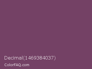 Decimal 1469384037 Color is a normal magenta color and the nearest color is Cosmic #76395d. Hex code #744165 and RGB value is rgb(116,65,101). In RGB color space, this color is composed of 45% red, 25% green, 40% blue, In CMYK color space, this color is composed of 0% cyan, 44% magenta, 13% yellow , 55% black , In HSL color space, this color has a hue angle of 318° , 28% saturation and 35% lightness.