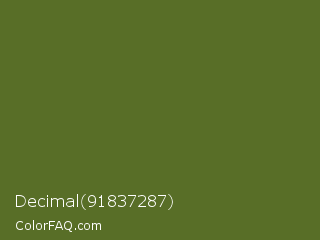 Decimal 91837287 Color is a dark lime color and the nearest color is Dark Olive Green #556b2f. Hex code #586e27 and RGB value is rgb(88,110,39). In RGB color space, this color is composed of 35% red, 43% green, 15% blue, In CMYK color space, this color is composed of 20% cyan, 0% magenta, 65% yellow , 57% black , In HSL color space, this color has a hue angle of 79° , 48% saturation and 29% lightness.