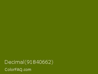 Decimal 91840662 Color is a very dark lime color and the nearest color is Avocado #568203. Hex code #587100 and RGB value is rgb(88,113,0). In RGB color space, this color is composed of 35% red, 44% green, 0% blue, In CMYK color space, this color is composed of 22% cyan, 0% magenta, 100% yellow , 56% black , In HSL color space, this color has a hue angle of 73° , 100% saturation and 22% lightness.
