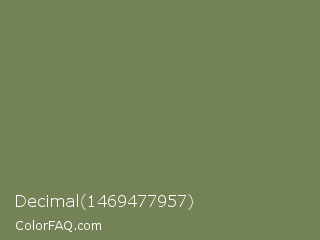 Decimal 1469477957 Color is a normal green color and the nearest color is Limed Ash #747d63. Hex code #748355 and RGB value is rgb(116,131,85). In RGB color space, this color is composed of 45% red, 51% green, 33% blue, In CMYK color space, this color is composed of 11% cyan, 0% magenta, 35% yellow , 49% black , In HSL color space, this color has a hue angle of 80° , 21% saturation and 42% lightness.