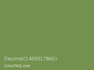 Decimal 1469517860 Color is a normal green color and the nearest color is Palm Leaf #6f9940. Hex code #749150 and RGB value is rgb(116,145,80). In RGB color space, this color is composed of 45% red, 57% green, 31% blue, In CMYK color space, this color is composed of 20% cyan, 0% magenta, 45% yellow , 43% black , In HSL color space, this color has a hue angle of 87° , 29% saturation and 44% lightness.