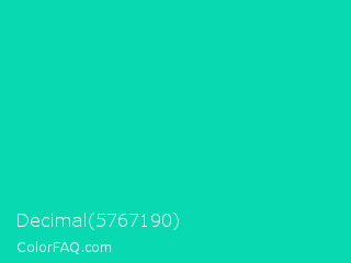 Decimal 5767190 Color is a normal cyan color and the nearest color is Amazonite #00c4b0. Hex code #08d9b0 and RGB value is rgb(8,217,176). In RGB color space, this color is composed of 3% red, 85% green, 69% blue, In CMYK color space, this color is composed of 96% cyan, 0% magenta, 19% yellow , 15% black , In HSL color space, this color has a hue angle of 168° , 93% saturation and 44% lightness.