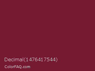 Decimal 1476417544 Color is a dark red color and the nearest color is Claret #7f1734. Hex code #751930 and RGB value is rgb(117,25,48). In RGB color space, this color is composed of 46% red, 10% green, 19% blue, In CMYK color space, this color is composed of 0% cyan, 79% magenta, 59% yellow , 54% black , In HSL color space, this color has a hue angle of 345° , 65% saturation and 28% lightness.