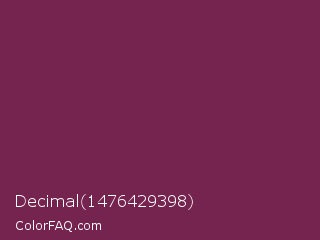 Decimal 1476429398 Color is a dark magenta color and the nearest color is Pansy Purple #78184a. Hex code #752450 and RGB value is rgb(117,36,80). In RGB color space, this color is composed of 46% red, 14% green, 31% blue, In CMYK color space, this color is composed of 0% cyan, 69% magenta, 32% yellow , 54% black , In HSL color space, this color has a hue angle of 327° , 53% saturation and 30% lightness.