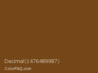 Decimal 1476489987 Color is a dark orange color and the nearest color is Raw Umber #734a12. Hex code #754617 and RGB value is rgb(117,70,23). In RGB color space, this color is composed of 46% red, 27% green, 9% blue, In CMYK color space, this color is composed of 0% cyan, 40% magenta, 80% yellow , 54% black , In HSL color space, this color has a hue angle of 30° , 67% saturation and 27% lightness.