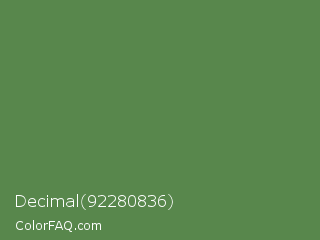 Decimal 92280836 Color is a normal green color and the nearest color is Hippie Green #53824b. Hex code #58874c and RGB value is rgb(88,135,76). In RGB color space, this color is composed of 35% red, 53% green, 30% blue, In CMYK color space, this color is composed of 35% cyan, 0% magenta, 44% yellow , 47% black , In HSL color space, this color has a hue angle of 108° , 28% saturation and 41% lightness.