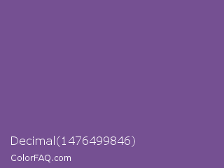 Decimal 1476499846 Color is a normal purple color and the nearest color is Dark Lavender #734f96. Hex code #755092 and RGB value is rgb(117,80,146). In RGB color space, this color is composed of 46% red, 31% green, 57% blue, In CMYK color space, this color is composed of 20% cyan, 45% magenta, 0% yellow , 43% black , In HSL color space, this color has a hue angle of 274° , 29% saturation and 44% lightness.