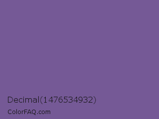 Decimal 1476534932 Color is a normal violet color and the nearest color is Dark Lavender #734f96. Hex code #755996 and RGB value is rgb(117,89,150). In RGB color space, this color is composed of 46% red, 35% green, 59% blue, In CMYK color space, this color is composed of 22% cyan, 41% magenta, 0% yellow , 41% black , In HSL color space, this color has a hue angle of 268° , 26% saturation and 47% lightness.