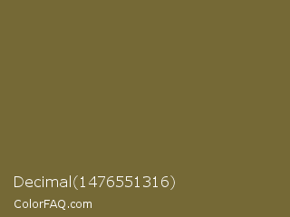 Decimal 1476551316 Color is a normal yellow color and the nearest color is Yellow Metal #716338. Hex code #756936 and RGB value is rgb(117,105,54). In RGB color space, this color is composed of 46% red, 41% green, 21% blue, In CMYK color space, this color is composed of 0% cyan, 10% magenta, 54% yellow , 54% black , In HSL color space, this color has a hue angle of 49° , 37% saturation and 34% lightness.