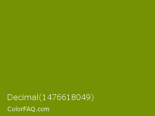 Decimal 1476618049 Color is a dark lime color and the nearest color is Limeade #6f9d02. Hex code #759205 and RGB value is rgb(117,146,5). In RGB color space, this color is composed of 46% red, 57% green, 2% blue, In CMYK color space, this color is composed of 20% cyan, 0% magenta, 97% yellow , 43% black , In HSL color space, this color has a hue angle of 72° , 93% saturation and 30% lightness.