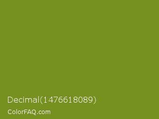 Decimal 1476618089 Color is a normal lime color and the nearest color is Wasabi #788a25. Hex code #759221 and RGB value is rgb(117,146,33). In RGB color space, this color is composed of 46% red, 57% green, 13% blue, In CMYK color space, this color is composed of 20% cyan, 0% magenta, 77% yellow , 43% black , In HSL color space, this color has a hue angle of 75° , 63% saturation and 35% lightness.