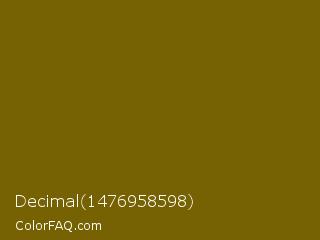 Decimal 1476958598 Color is a dark yellow color and the nearest color is Yukon Gold #7b6608. Hex code #766202 and RGB value is rgb(118,98,2). In RGB color space, this color is composed of 46% red, 38% green, 1% blue, In CMYK color space, this color is composed of 0% cyan, 17% magenta, 98% yellow , 54% black , In HSL color space, this color has a hue angle of 50° , 97% saturation and 24% lightness.