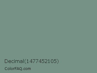 Decimal 1477452105 Color is a normal green color and the nearest color is Blue Smoke #748881. Hex code #769185 and RGB value is rgb(118,145,133). In RGB color space, this color is composed of 46% red, 57% green, 52% blue, In CMYK color space, this color is composed of 19% cyan, 0% magenta, 8% yellow , 43% black , In HSL color space, this color has a hue angle of 153° , 11% saturation and 52% lightness.