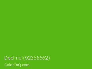 Decimal 92356662 Color is a normal green color and the nearest color is Kelly Green #4cbb17. Hex code #58b714 and RGB value is rgb(88,183,20). In RGB color space, this color is composed of 35% red, 72% green, 8% blue, In CMYK color space, this color is composed of 52% cyan, 0% magenta, 89% yellow , 28% black , In HSL color space, this color has a hue angle of 95° , 80% saturation and 40% lightness.