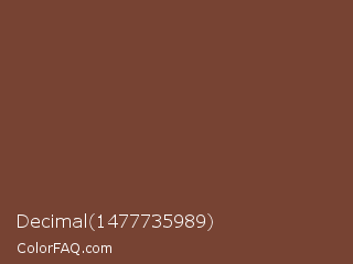 Decimal 1477735989 Color is a normal red color and the nearest color is Medium Tuscan Red #79443b. Hex code #774333 and RGB value is rgb(119,67,51). In RGB color space, this color is composed of 47% red, 26% green, 20% blue, In CMYK color space, this color is composed of 0% cyan, 44% magenta, 57% yellow , 53% black , In HSL color space, this color has a hue angle of 14° , 40% saturation and 33% lightness.