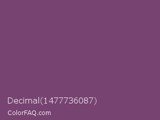 Decimal 1477736087 Color is a normal magenta color and the nearest color is Cannon Pink #894367. Hex code #774371 and RGB value is rgb(119,67,113). In RGB color space, this color is composed of 47% red, 26% green, 44% blue, In CMYK color space, this color is composed of 0% cyan, 44% magenta, 5% yellow , 53% black , In HSL color space, this color has a hue angle of 307° , 28% saturation and 36% lightness.