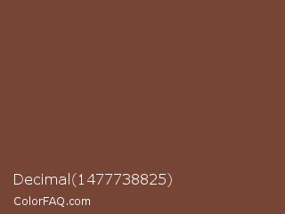 Decimal 1477738825 Color is a normal color and the nearest color is Medium Tuscan Red #79443b. Hex code #774535 and RGB value is rgb(119,69,53). In RGB color space, this color is composed of 47% red, 27% green, 21% blue, In CMYK color space, this color is composed of 0% cyan, 42% magenta, 55% yellow , 53% black , In HSL color space, this color has a hue angle of 15° , 38% saturation and 34% lightness.