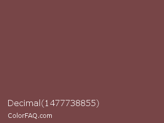 Decimal 1477738855 Color is a normal red color and the nearest color is Tuscan Red #7c4848. Hex code #774547 and RGB value is rgb(119,69,71). In RGB color space, this color is composed of 47% red, 27% green, 28% blue, In CMYK color space, this color is composed of 0% cyan, 42% magenta, 40% yellow , 53% black , In HSL color space, this color has a hue angle of 358° , 27% saturation and 37% lightness.