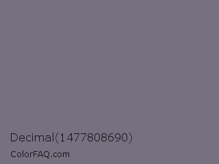 Decimal 1477808690 Color is a normal violet color and the nearest color is Storm Gray #717486. Hex code #777080 and RGB value is rgb(119,112,128). In RGB color space, this color is composed of 47% red, 44% green, 50% blue, In CMYK color space, this color is composed of 7% cyan, 13% magenta, 0% yellow , 50% black , In HSL color space, this color has a hue angle of 266° , 7% saturation and 47% lightness.