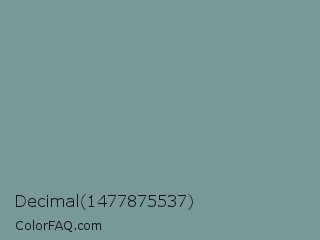 Decimal 1477875537 Color is a normal cyan color and the nearest color is Sea Nymph #78a39c. Hex code #779997 and RGB value is rgb(119,153,151). In RGB color space, this color is composed of 47% red, 60% green, 59% blue, In CMYK color space, this color is composed of 22% cyan, 0% magenta, 1% yellow , 40% black , In HSL color space, this color has a hue angle of 176° , 14% saturation and 53% lightness.