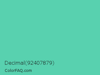 Decimal 92407879 Color is a normal green color and the nearest color is Medium Aquamarine #66ddaa. Hex code #58d1af and RGB value is rgb(88,209,175). In RGB color space, this color is composed of 35% red, 82% green, 69% blue, In CMYK color space, this color is composed of 58% cyan, 0% magenta, 16% yellow , 18% black , In HSL color space, this color has a hue angle of 163° , 57% saturation and 58% lightness.