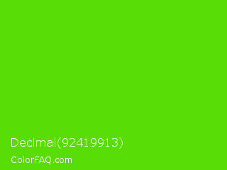 Decimal 92419913 Color is a normal green color and the nearest color is Harlequin Green #46cb18. Hex code #58dd05 and RGB value is rgb(88,221,5). In RGB color space, this color is composed of 35% red, 87% green, 2% blue, In CMYK color space, this color is composed of 60% cyan, 0% magenta, 98% yellow , 13% black , In HSL color space, this color has a hue angle of 97° , 96% saturation and 44% lightness.