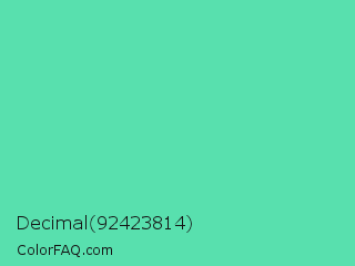 Decimal 92423814 Color is a light green color and the nearest color is Medium Aquamarine #66ddaa. Hex code #58e0ae and RGB value is rgb(88,224,174). In RGB color space, this color is composed of 35% red, 88% green, 68% blue, In CMYK color space, this color is composed of 61% cyan, 0% magenta, 22% yellow , 12% black , In HSL color space, this color has a hue angle of 158° , 69% saturation and 61% lightness.
