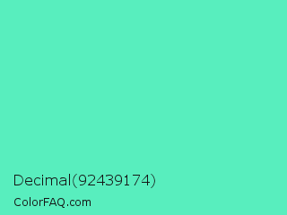 Decimal 92439174 Color is a light green color and the nearest color is Medium Aquamarine #66ddaa. Hex code #58eebe and RGB value is rgb(88,238,190). In RGB color space, this color is composed of 35% red, 93% green, 75% blue, In CMYK color space, this color is composed of 63% cyan, 0% magenta, 20% yellow , 7% black , In HSL color space, this color has a hue angle of 161° , 82% saturation and 64% lightness.