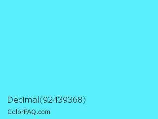 Decimal 92439368 Color is a light cyan color and the nearest color is Turquoise Blue #6cdae7. Hex code #58eefc and RGB value is rgb(88,238,252). In RGB color space, this color is composed of 35% red, 93% green, 99% blue, In CMYK color space, this color is composed of 65% cyan, 6% magenta, 0% yellow , 1% black , In HSL color space, this color has a hue angle of 185° , 96% saturation and 67% lightness.