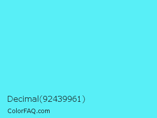 Decimal 92439961 Color is a light cyan color and the nearest color is Turquoise Blue #6cdae7. Hex code #58eff7 and RGB value is rgb(88,239,247). In RGB color space, this color is composed of 35% red, 94% green, 97% blue, In CMYK color space, this color is composed of 64% cyan, 3% magenta, 0% yellow , 3% black , In HSL color space, this color has a hue angle of 183° , 91% saturation and 66% lightness.