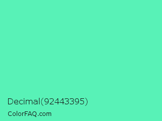 Decimal 92443395 Color is a light green color and the nearest color is Medium Aquamarine #66ddaa. Hex code #58f2b7 and RGB value is rgb(88,242,183). In RGB color space, this color is composed of 35% red, 95% green, 72% blue, In CMYK color space, this color is composed of 64% cyan, 0% magenta, 24% yellow , 5% black , In HSL color space, this color has a hue angle of 157° , 86% saturation and 65% lightness.